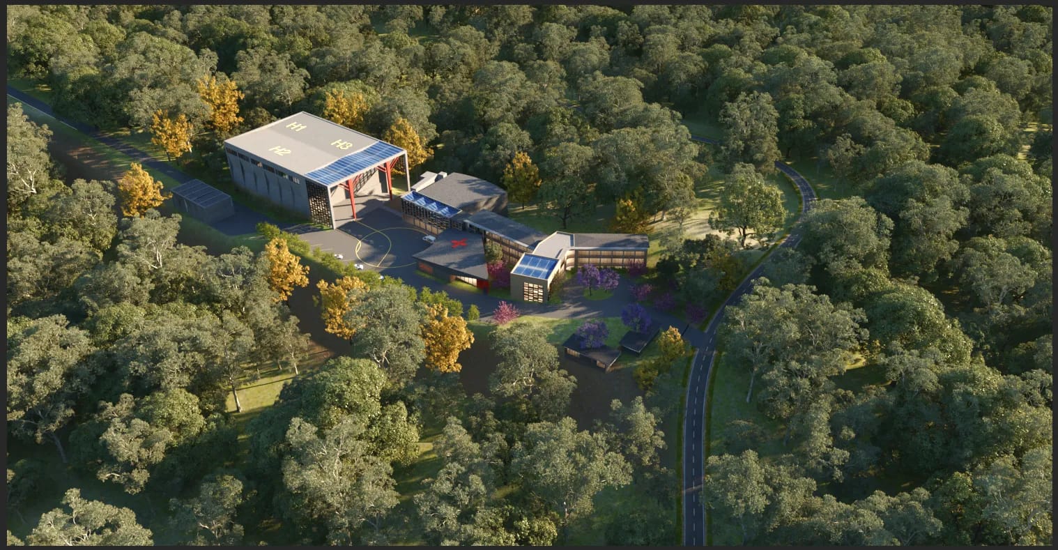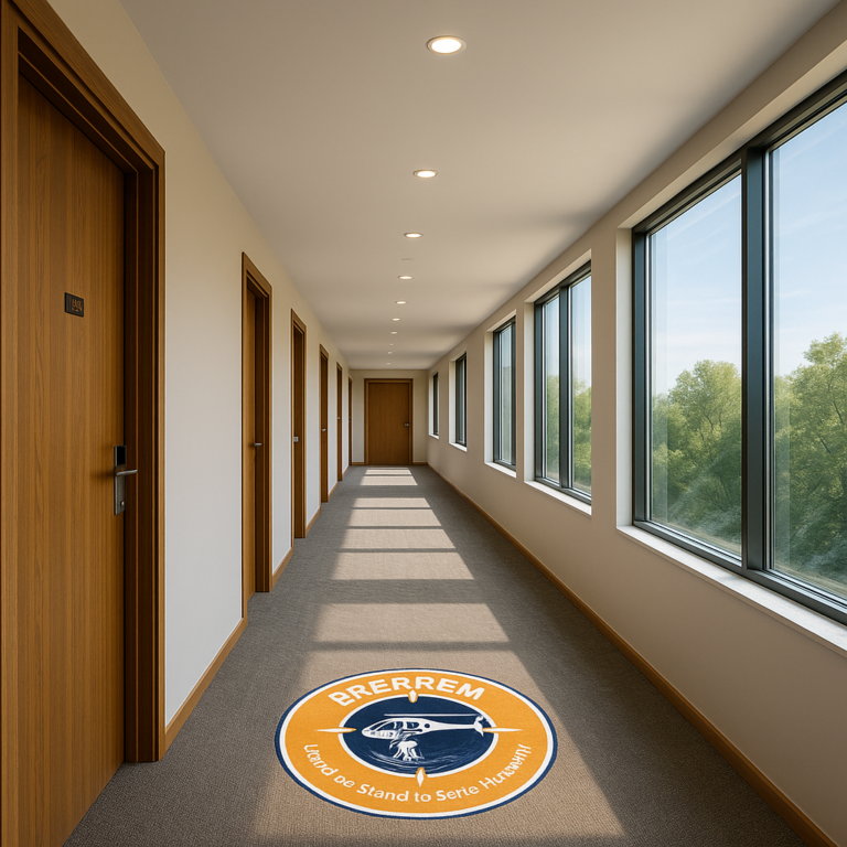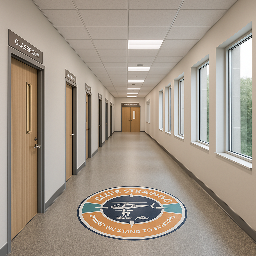 This image captures the academic wing, with a total of 10 training rooms, research centre, gym and laundry for the students. Where theory meets practice in the pursuit of lifesaving excellence. The hallway leads to multiple classrooms and briefing rooms, each designed for advanced learning, team coordination, and scenario planning. Natural light streams through the large windows, creating an open and inspiring environment that encourages focus, collaboration, and innovation among trainees and instructors alike.