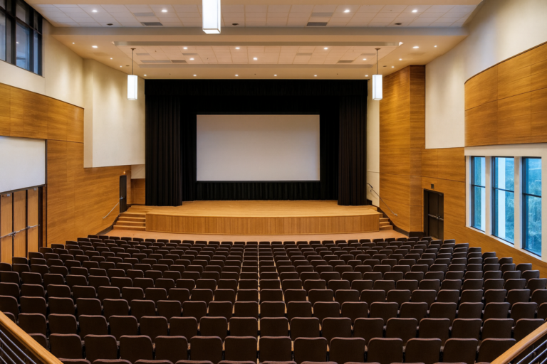 This image showcases the main auditorium, a centerpiece designed for large-scale conferences, training briefings, and international seminars. With tiered seating and a professional stage setup, the auditorium provides an ideal space for presentations, lectures, and collaborative discussions that bring together experts from emergency services, government agencies, and humanitarian organisations. The use of warm timber finishes and modern acoustic design creates a welcoming yet professional atmosphere, ensuring clear communication and comfort for every attendee.