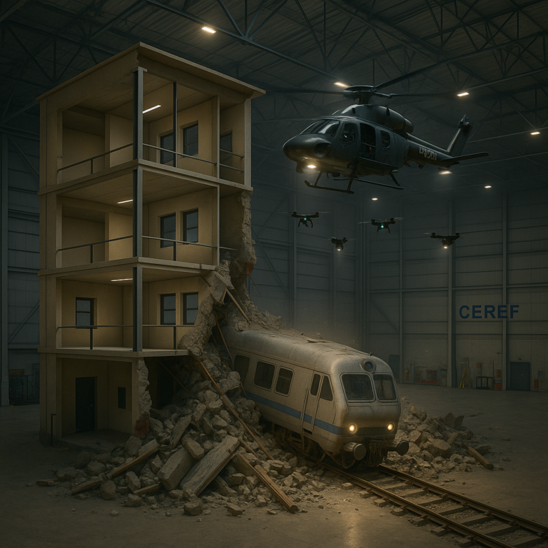 Above, a helicopter and aerial drones simulate air support and reconnaissance operations, integrating technology into rescue coordination. The scene demonstrates CEREF’s commitment to realism and innovation, combining ground operations with aerial response strategies. By blending immersive simulation with cutting-edge technology, the Dry Cell gives trainees the ability to practice time-critical decision-making and teamwork under lifelike conditions — preparing them to respond effectively when real disasters strike..