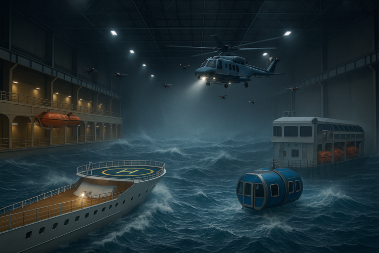 This image depicts Cell Three – The Ocean Cell, the most advanced maritime simulation environment, engineered to recreate realistic offshore and open-water emergency scenarios, the Ocean Cell features a large, wave-generating pool that simulates rough sea conditions, complete with vessels, lifeboats, and rescue pods. Above, a helicopter and drones conduct coordinated rescue operations, enabling trainees to practice offshore evacuation, air-sea rescue, and vessel emergency response under extreme weather conditions.