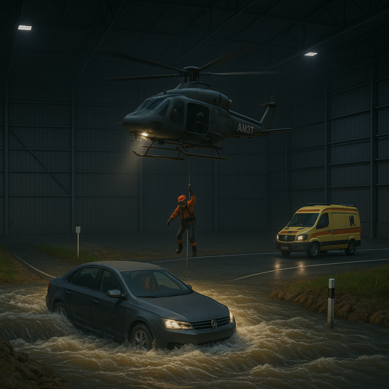 Cell Two – The Flood Cell, an advanced water rescue and flood response training environment. Designed to replicate real-world flood emergencies, this indoor simulation area allows responders to train safely in swift-water and vehicle submersion scenarios. The scene features a rescue helicopter performing a hoist operation over a partially submerged car, while emergency vehicles stand ready to assist — providing a fully immersive environment for multi-agency coordination, communication, and rescue precision.