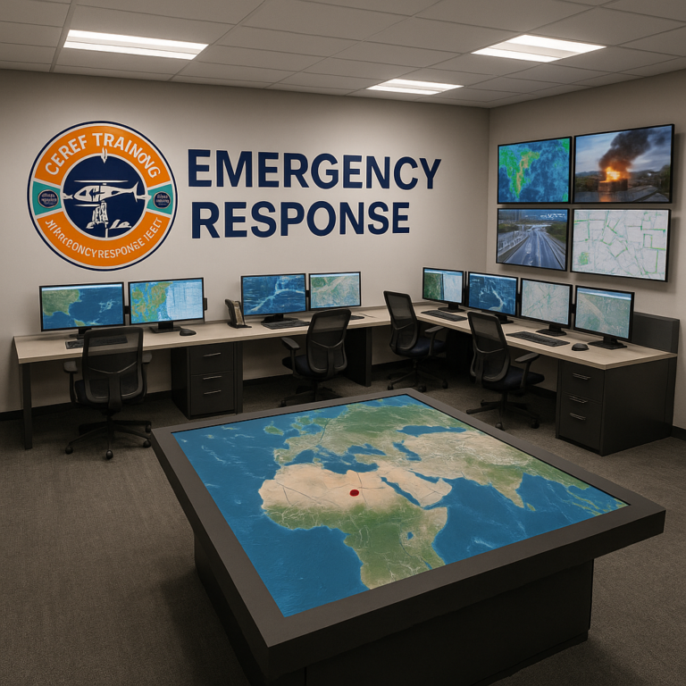 Dominated by the bold CEREF Training insignia and “Emergency Response” signage, the room embodies readiness, precision, and teamwork. This facility serves as a vital bridge between theoretical learning and practical application, preparing leaders to coordinate effectively under pressure. It’s here that teams train to anticipate challenges, assess evolving threats, and execute coordinated responses — reinforcing CEREF’s mission to strengthen global emergency preparedness and resilience.
