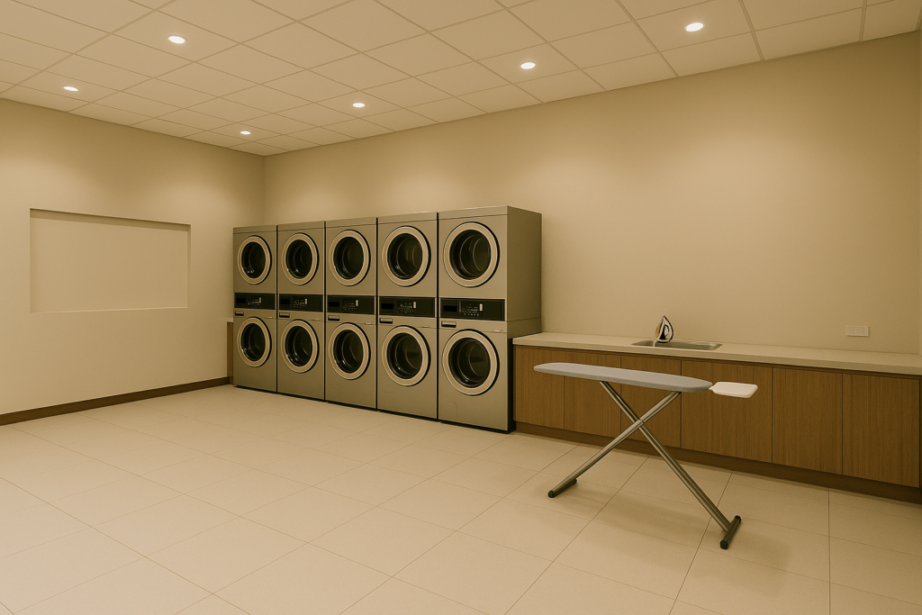 The CEREF Laundry & Uniform Care Facility is designed to maintain the highest standards of cleanliness and readiness for all trainees and emergency responders. Equipped with six commercial-grade washing machines and six high-efficiency dryers, the facility ensures that uniforms, gear, and linens are kept in optimal condition for daily use. The layout emphasizes workflow efficiency, with a dedicated ironing and folding area that supports quick turnaround times and professional presentation.