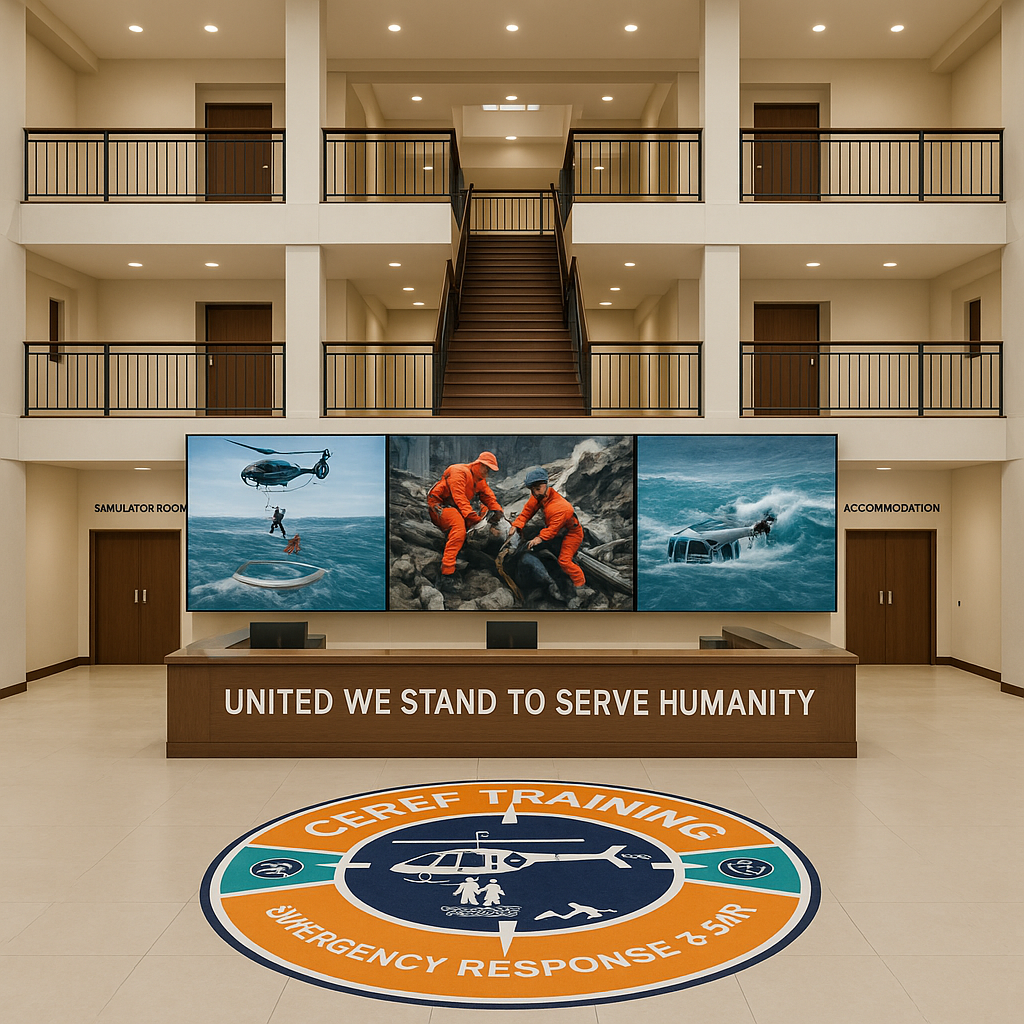 Behind the reception, a striking multi-screen display highlights CEREF’s dynamic rescue training — from helicopter hoist operations to flood and sea rescues — demonstrating the facility’s commitment to immersive, scenario-based education. Surrounding the atrium are clearly marked access points to the Simulator Room and Accommodation, ensuring a seamless connection between training, living, and learning. The clean architectural lines, open balconies, and warm lighting reflect professionalism, innovation, and a deep respect for the humanitarian spirit that drives CEREF’s global mission.