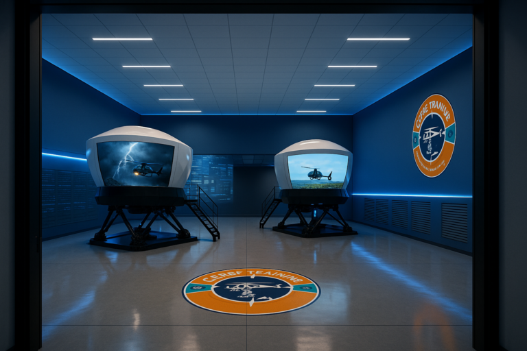 The door to the left of the reception is the Helicopter Simulation Room, the heart of its advanced training technology. Featuring state-of-the-art full-motion simulators, this room allows trainees to experience high-risk rescue operations in complete safety. Each simulator can replicate extreme weather conditions, night operations, and real-world emergency scenarios such as flood rescues, mountain extractions, and aerial evacuations. The immersive visual and motion systems prepare pilots and rescuers for the unpredictable challenges they face in the field.