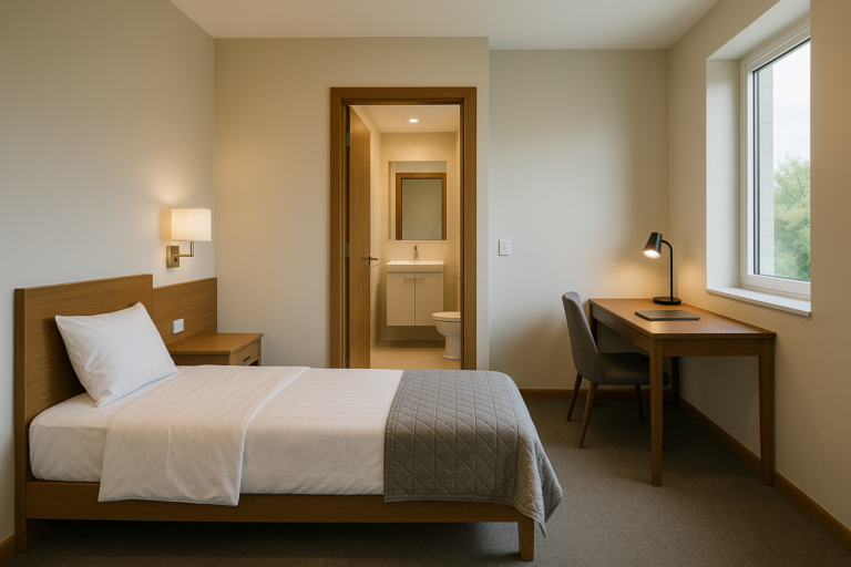 This image shows one of the accommodation rooms, designed to provide comfort, privacy, and relaxation for trainees and visiting professionals. Each room features a modern and minimalist design, furnished with a cozy single bed, work desk, and warm lighting — creating a restful atmosphere ideal for study and recovery. The large window allows natural light to fill the space, offering peaceful views of the surrounding natural landscape and reinforcing CEREF’s connection to the tranquil Canungra environment.